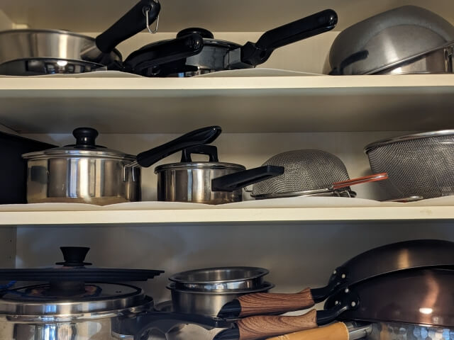 毎日使う調理器具は、手の届きやすい位置に収納し、頻繁に使わないものは、高い位置や奥のほうに収納するのがおすすめです。